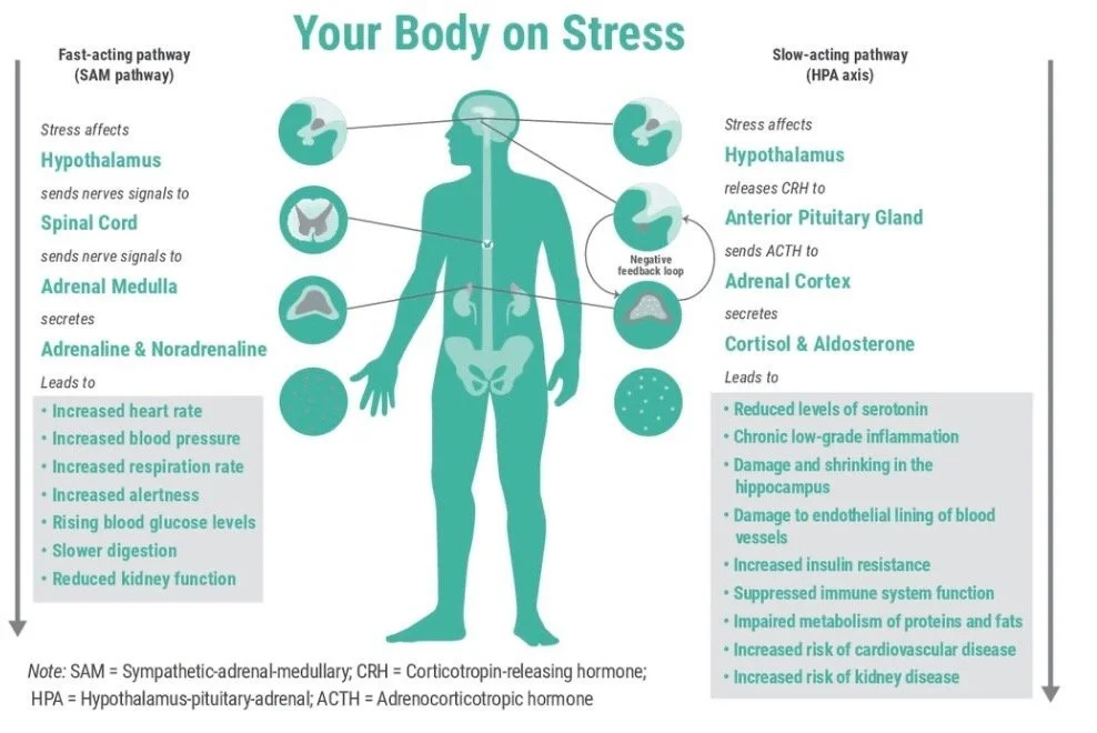 Irrespective of whether the stressor is perceived to be exciting or terrifying, the body is hardwired to respond with a physiological reaction comprised of a cascade of neural, hormonal, immune, and behavioral responses.
